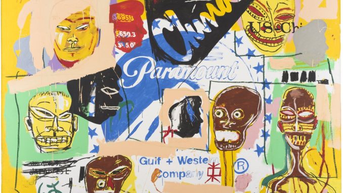 Cette toile fait partie de la collection de Nick Rhodes, clavier du groupe mythique Duran Duran. Le musicien entre dans le cercle rapproché des deux peintres lors de leur collaboration, et leur achète ce tableau. Ce grand format présente une iconographie riche où toutes les figures s’entremêlent : au centre, le logo Paramount évoque le cinéma cher à Warhol ; mais c’est aussi l’entreprise pour laquelle travaille son compagnon de l’époque, John Gould. Autre référence au 7e art : le président Ronald Reagan, un ancien acteur. Viennent s’ajouter les figures typiques de Basquiat et en arrière-plan, une esquisse d’une carte de Chine. Cette œuvre est l’expression même d’un syncrétisme entre leurs deux iconographies. « Il y a vraiment une accélération du dialogue dans cette peinture. On commence par le cinéma et on finit par le pop et la géopolitique », conclut Olivier Michelon.