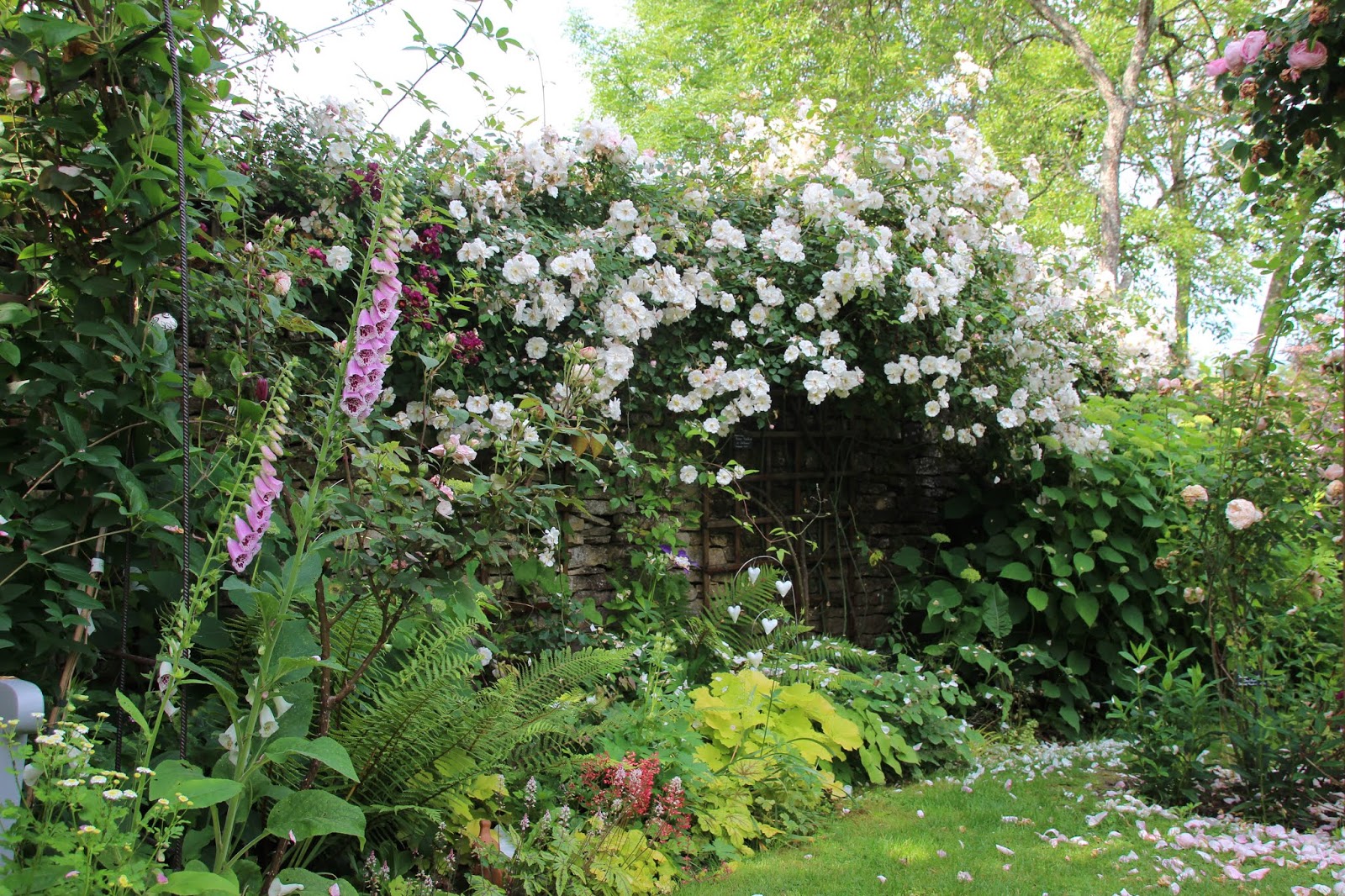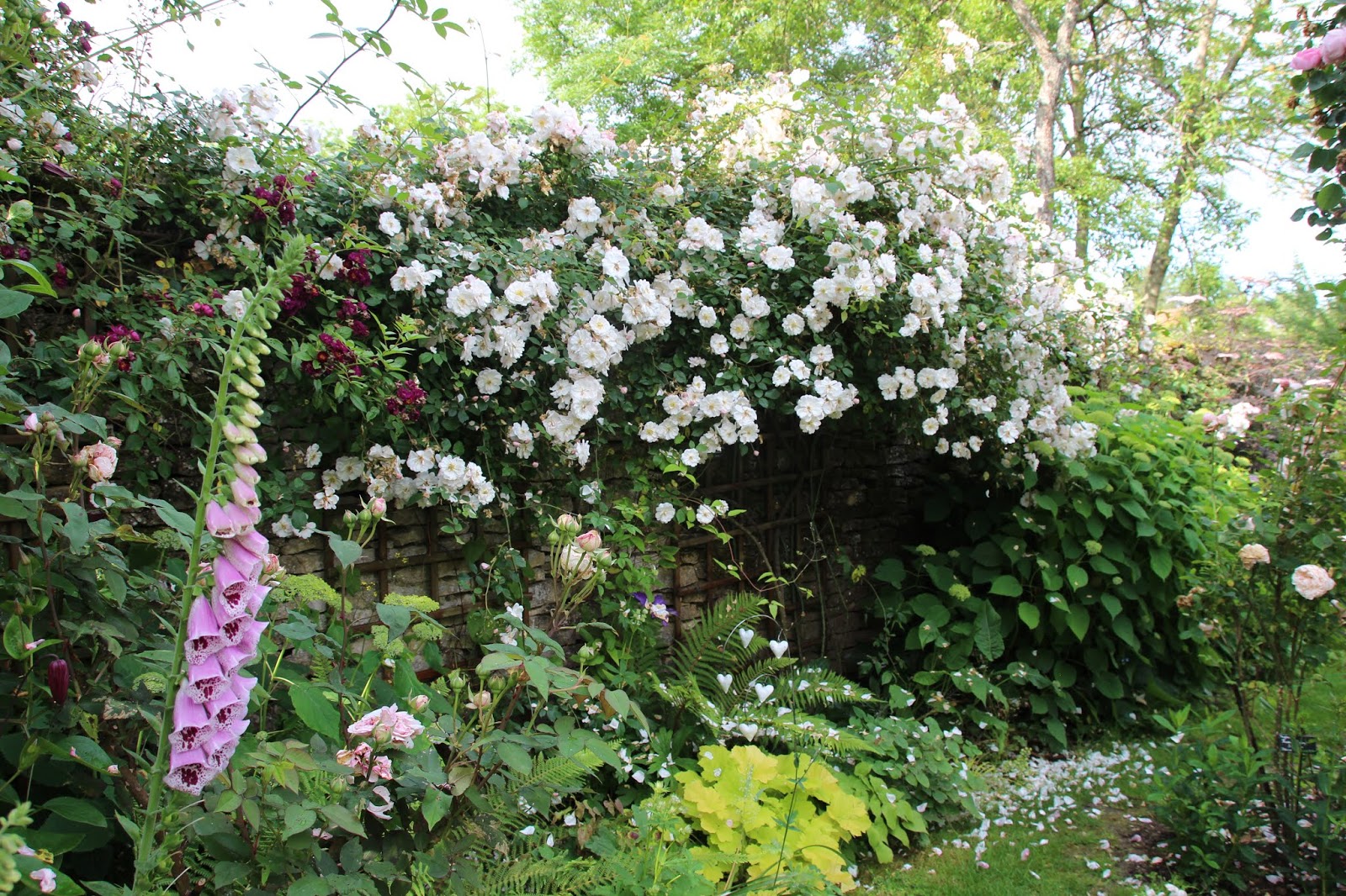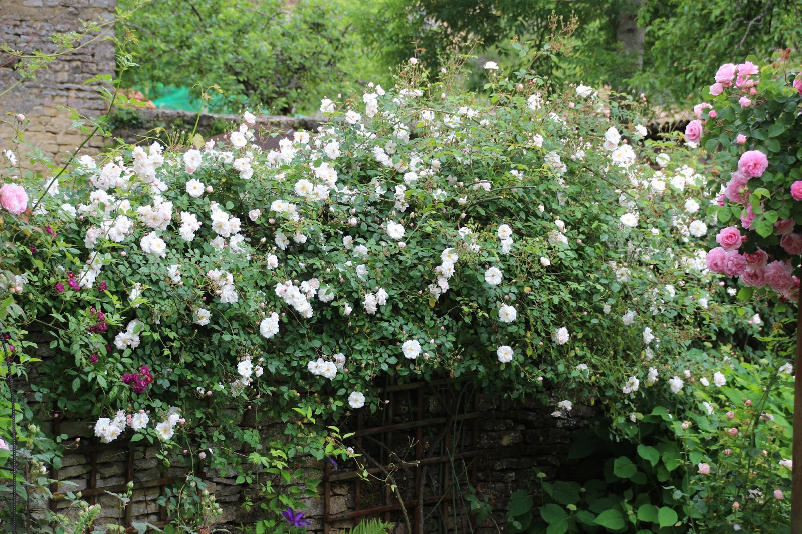Snow Goose et Mme Ernest Calvat encadrent le banc: les rosiers sont jeunes et dans des conditions difficiles mais j’espère que d’ici 2 ou 3 ans, l’arche sera bien couverte