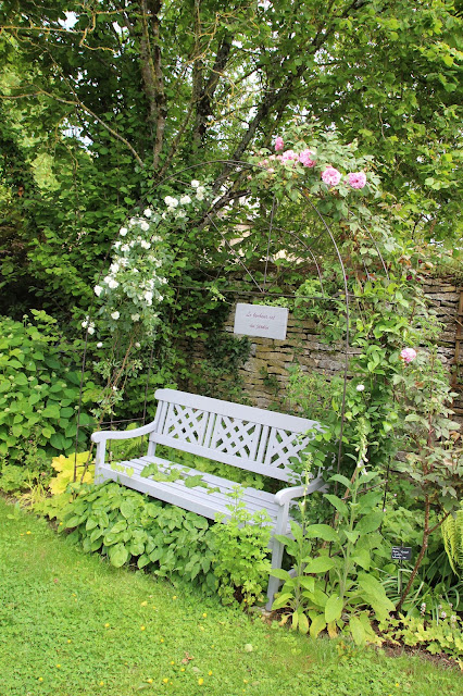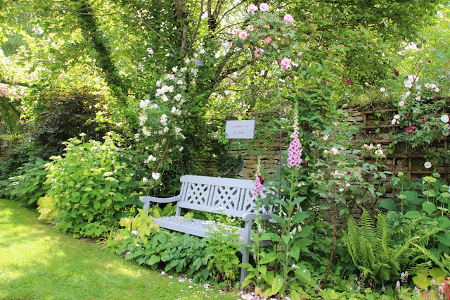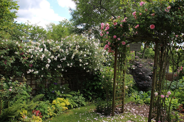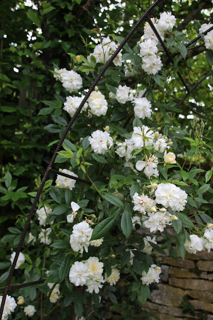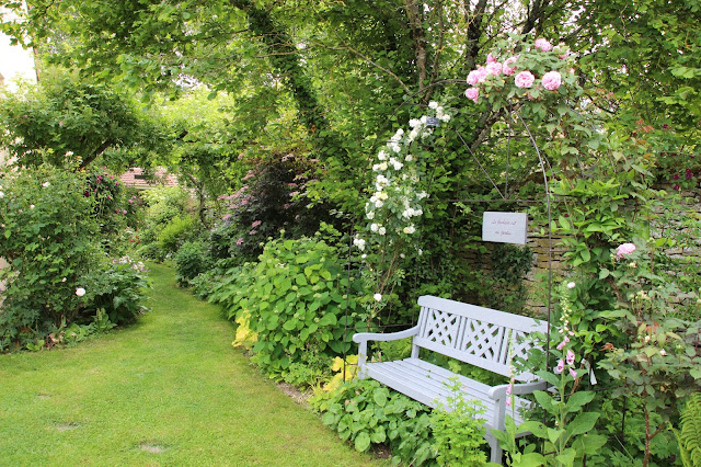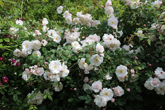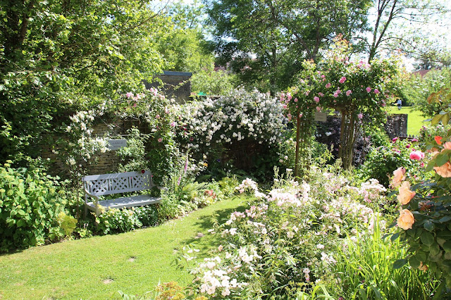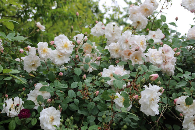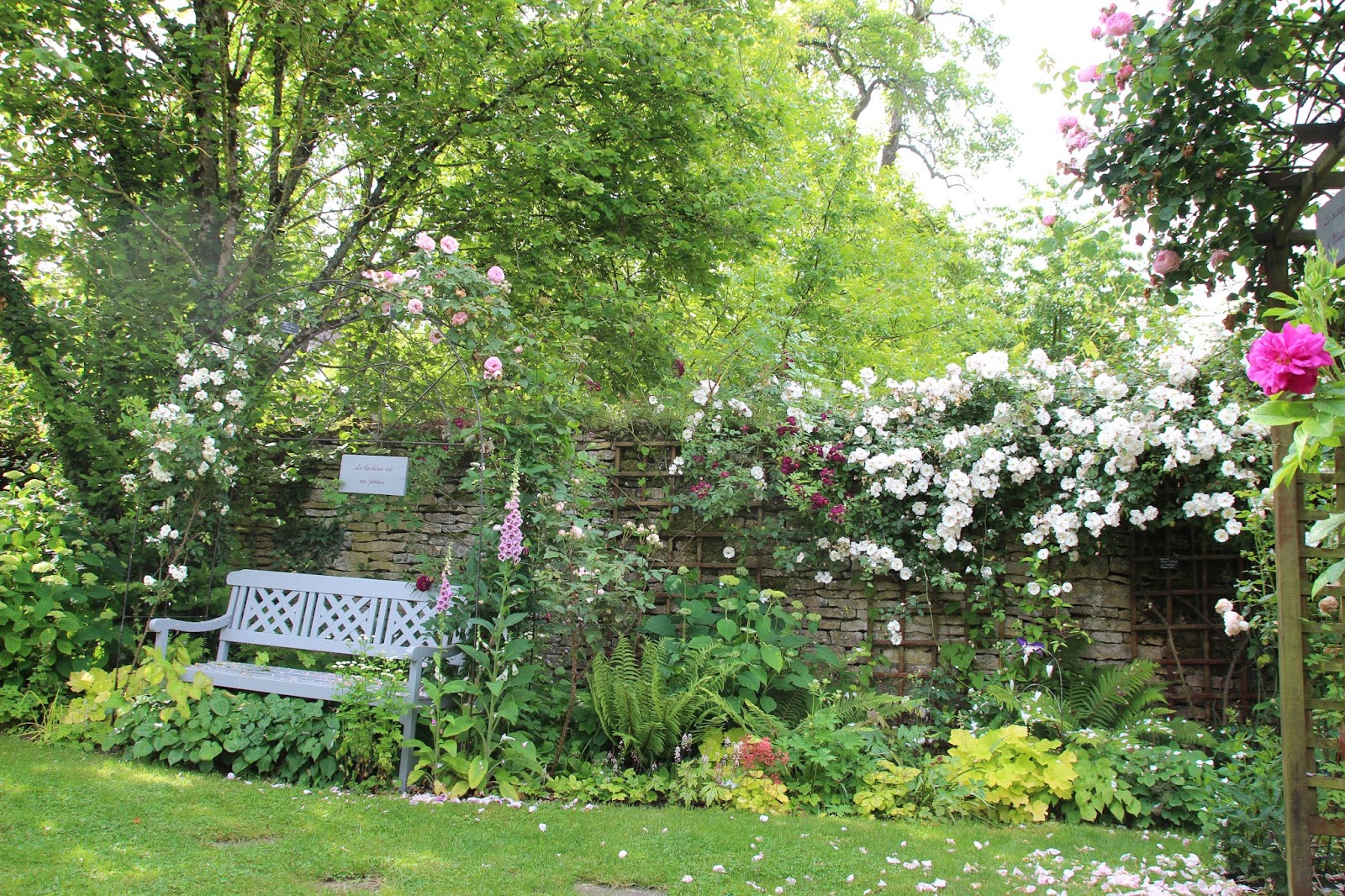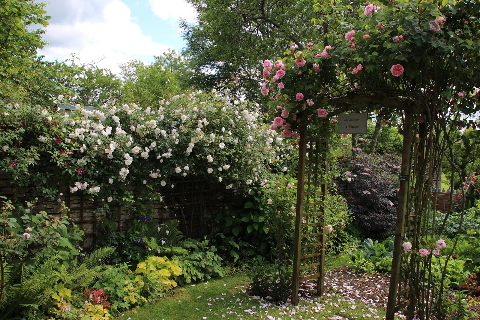 Snow Goose et Mme Ernest Calvat encadrent le banc: les rosiers sont jeunes et dans des conditions difficiles mais j’espère que d’ici 2 ou 3 ans, l’arche sera bien couverte