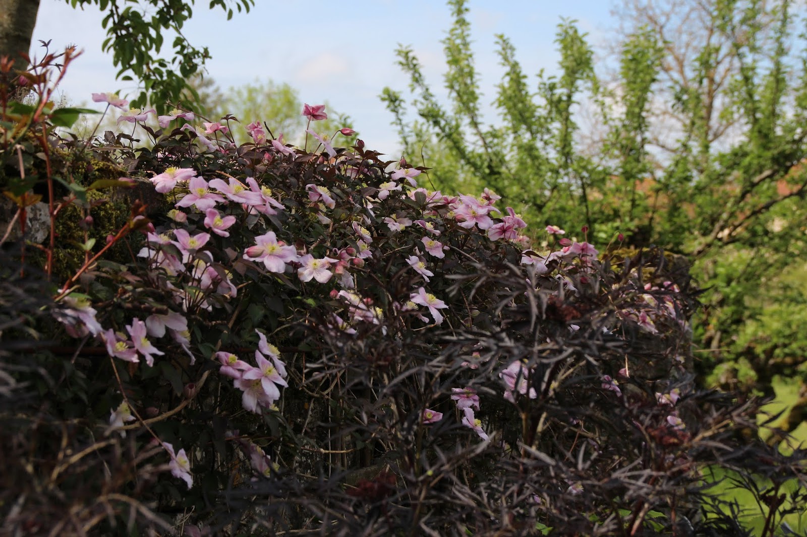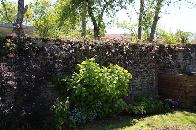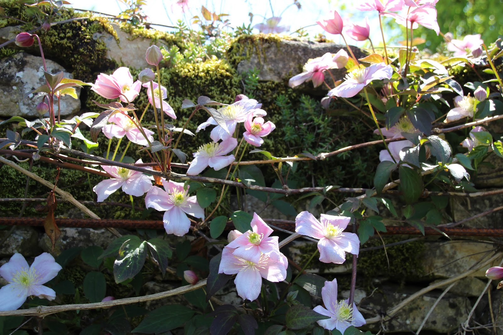 Derrière le potager, deux clématites montana ont été installées pour couvrir le mur