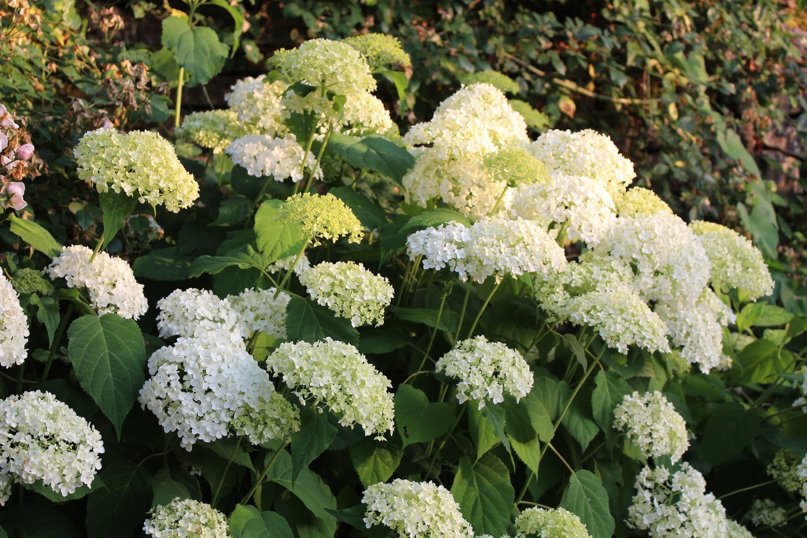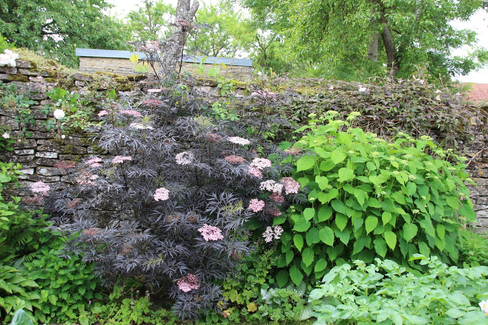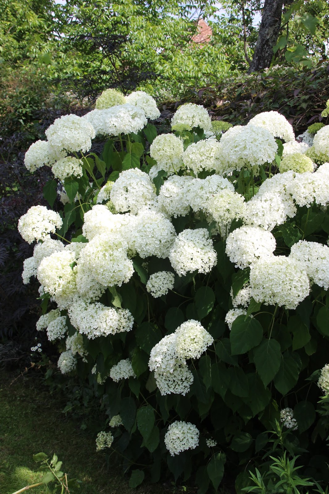 Le sureau black lace est également en fleurs, près de l’hydrangea annabelle