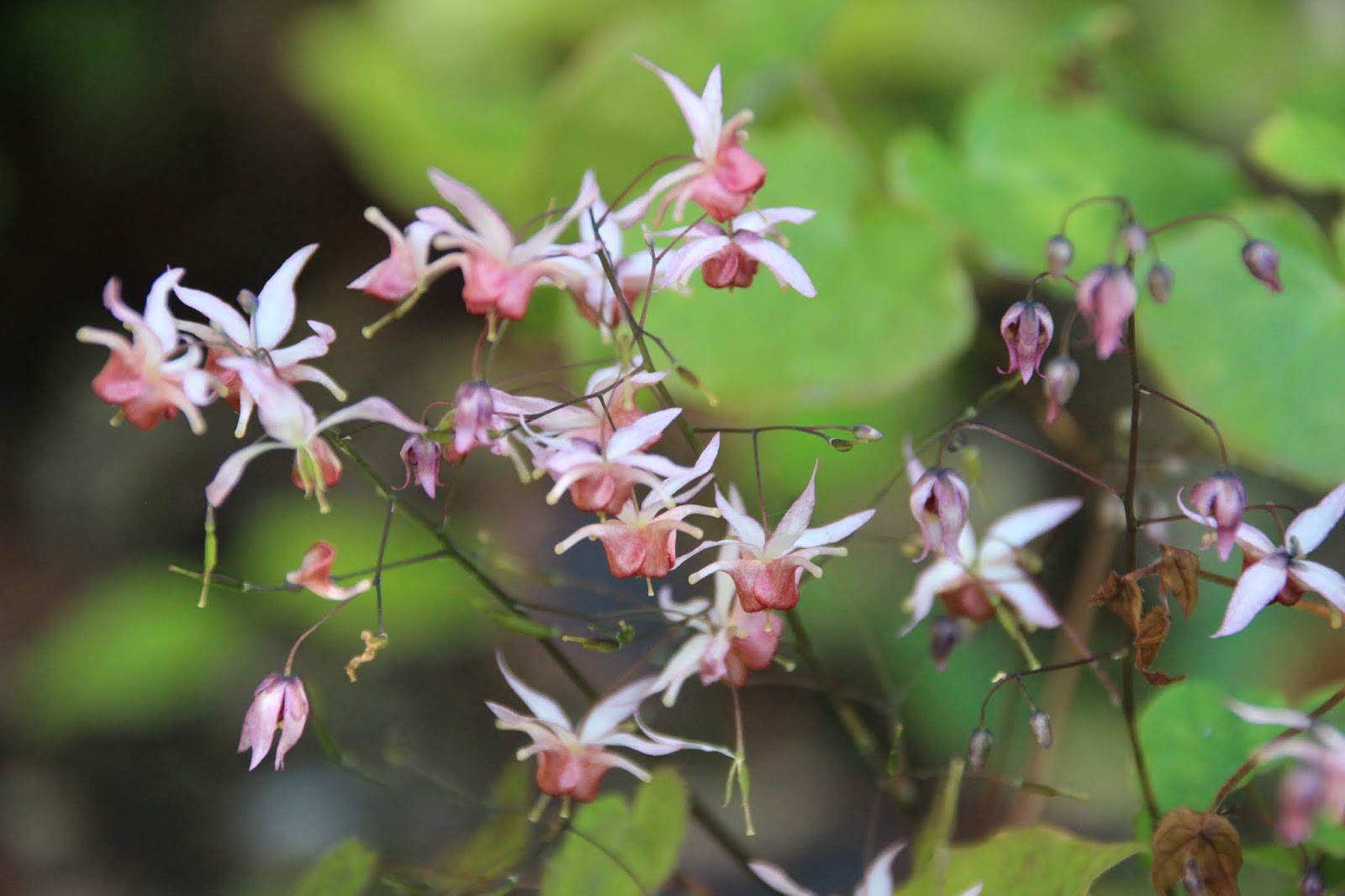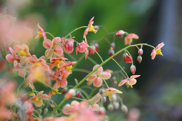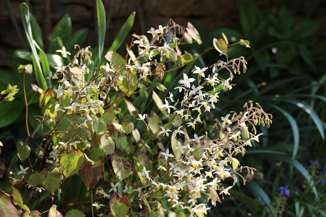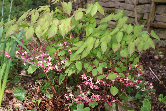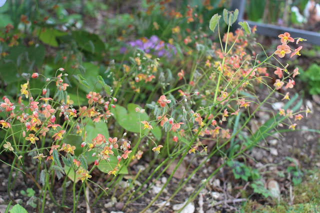 Sous le banc, les epimediums orange koningen sont en pleine floraison