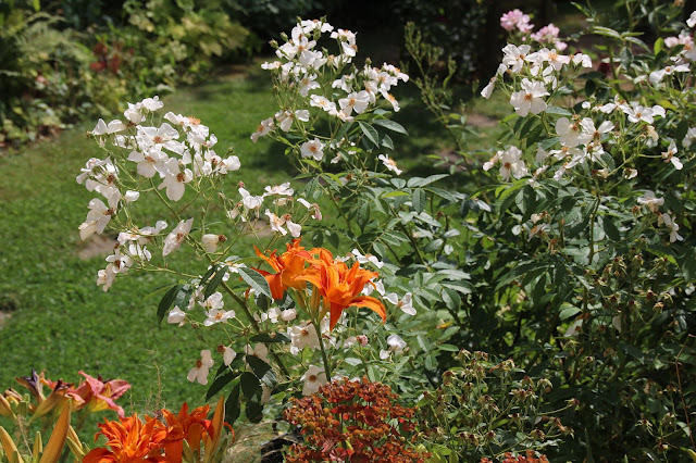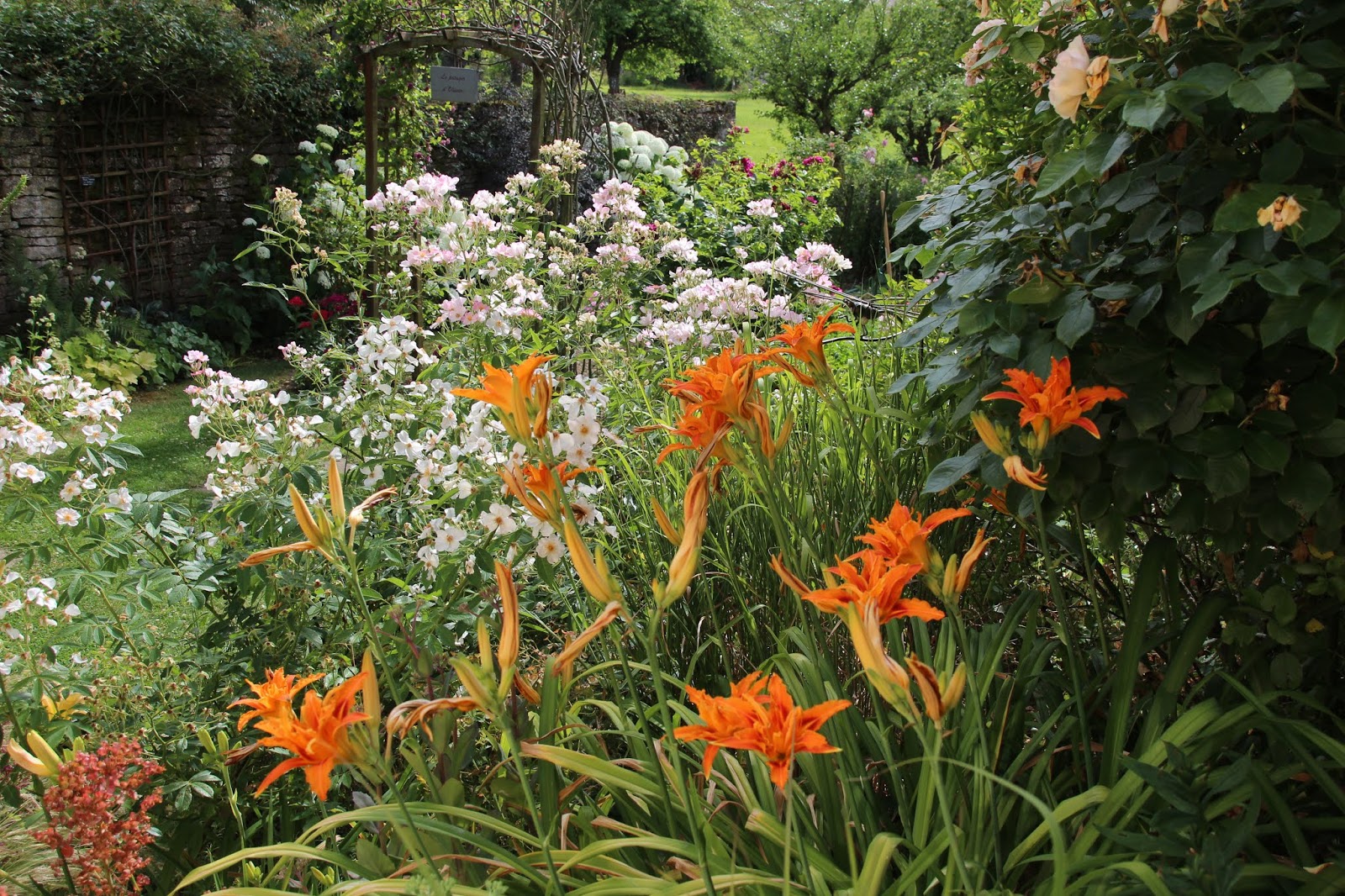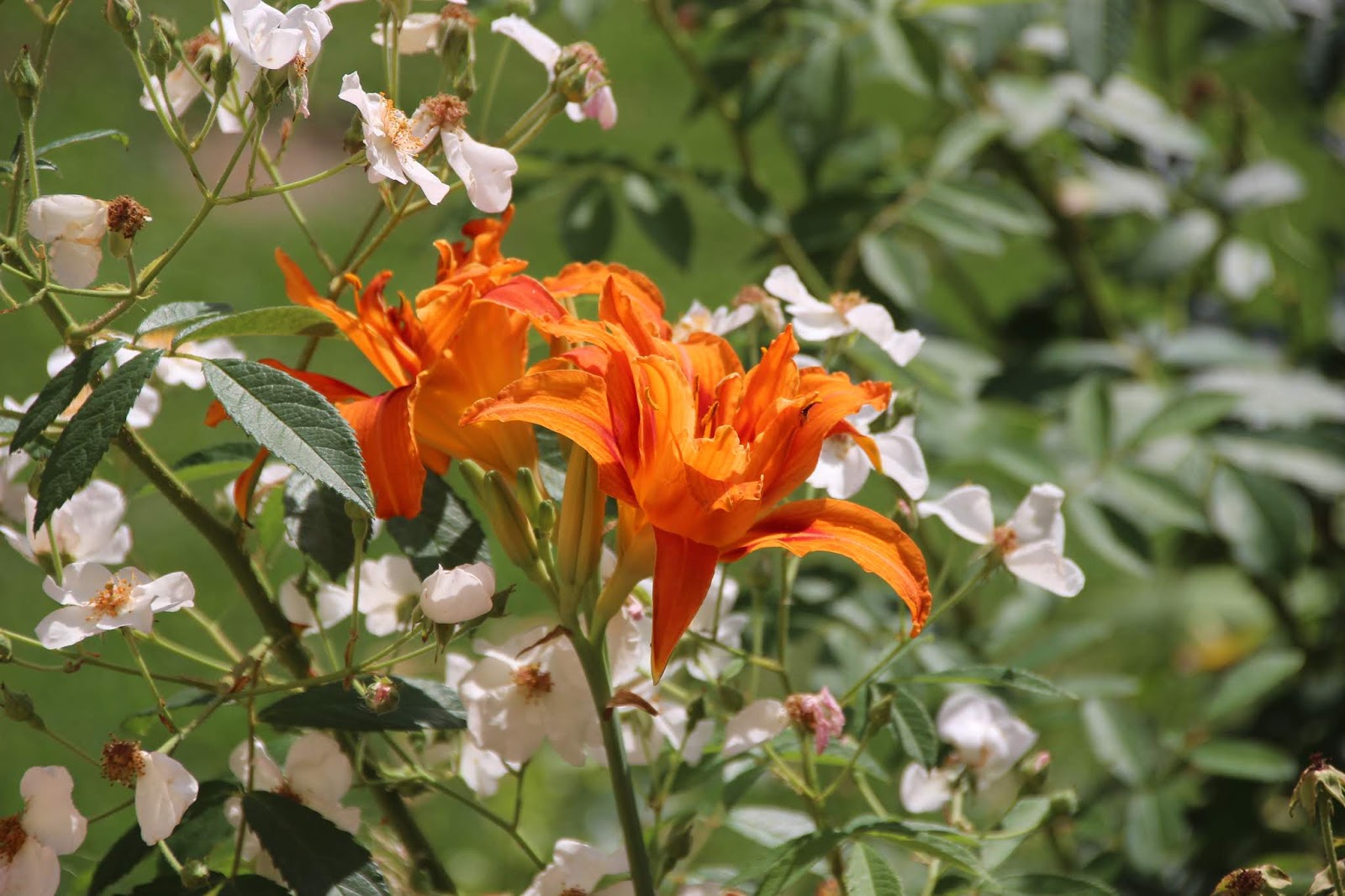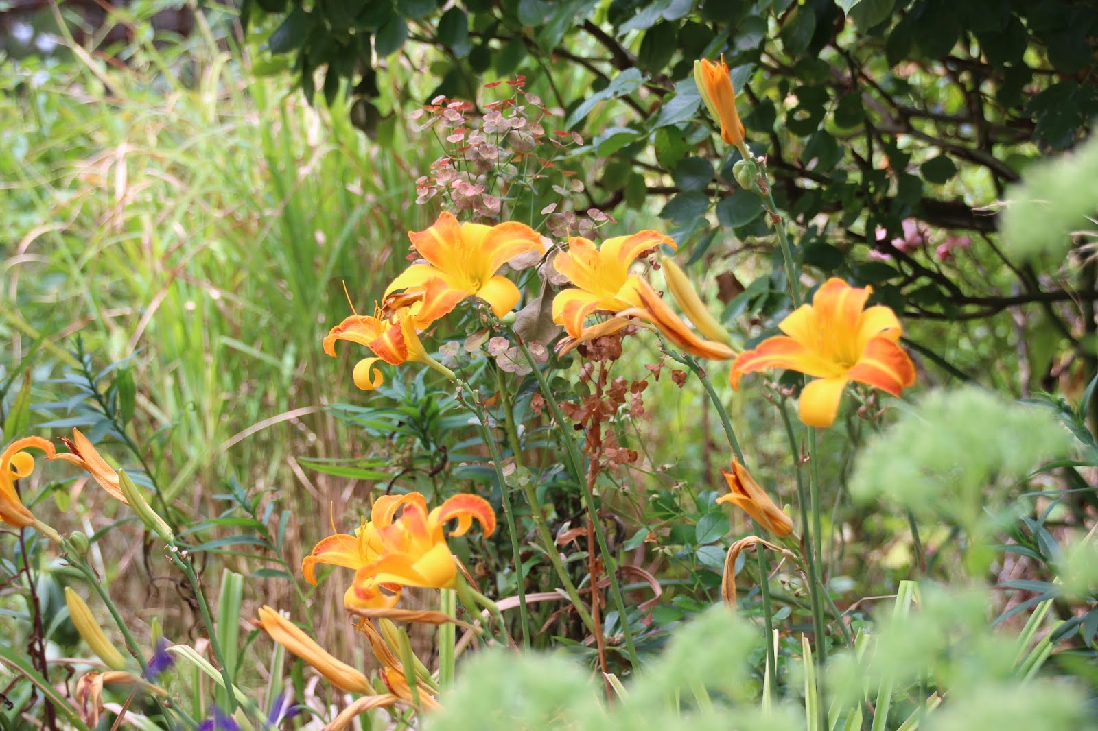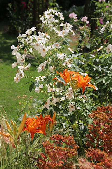 C’est le temps des hemerocalles, qui se mêlent aux floraisons des rosiers