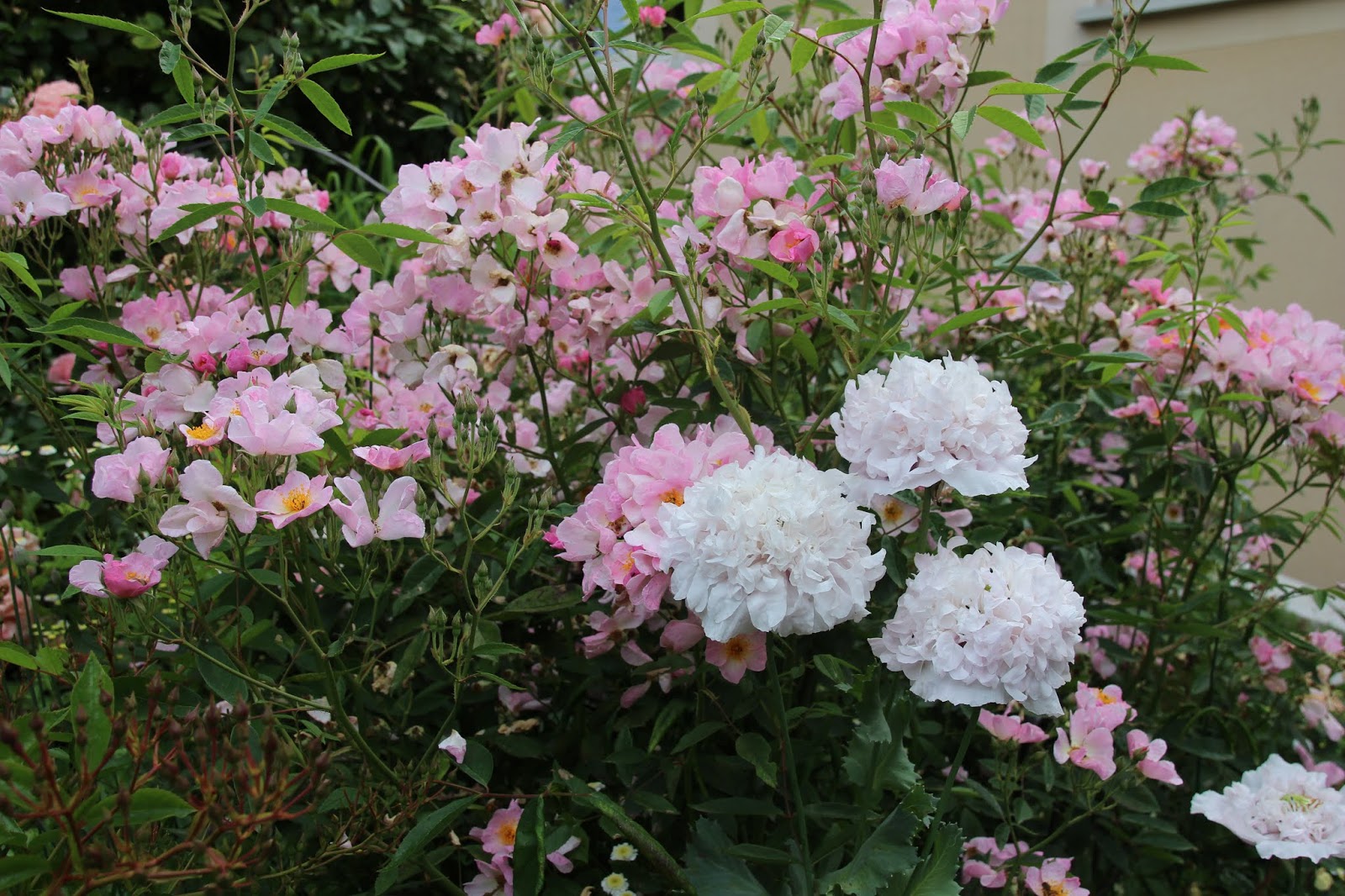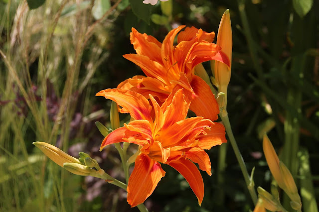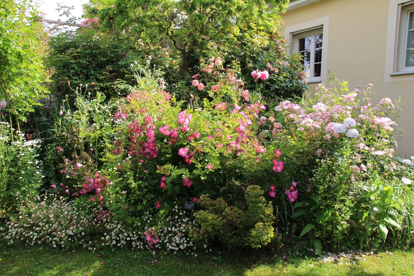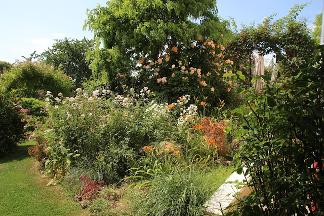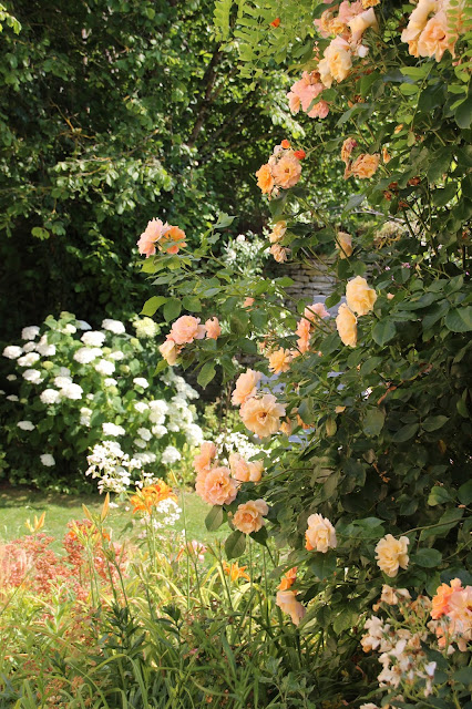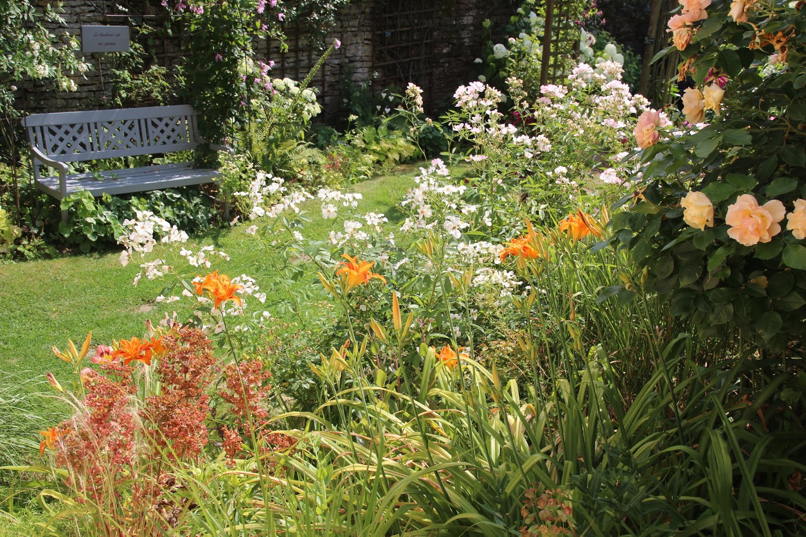 C’est le temps des hemerocalles, qui se mêlent aux floraisons des rosiers