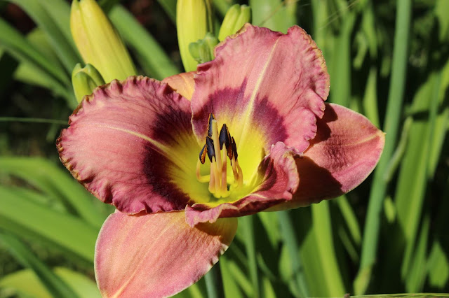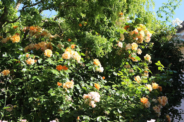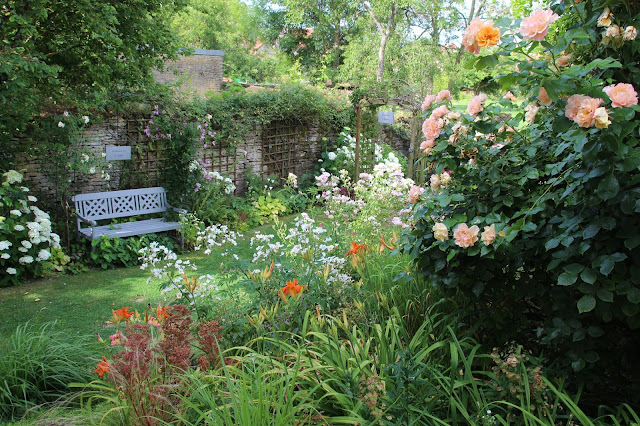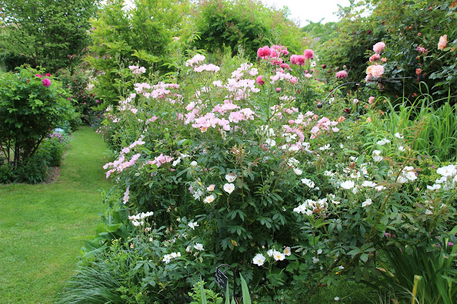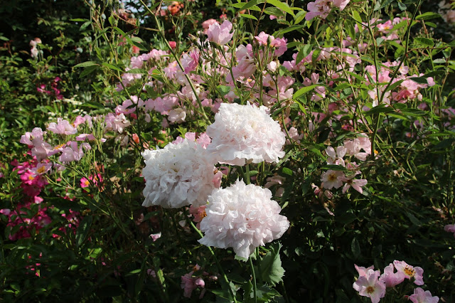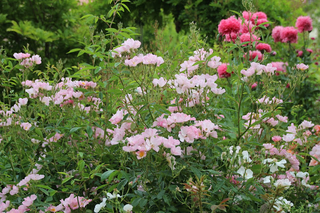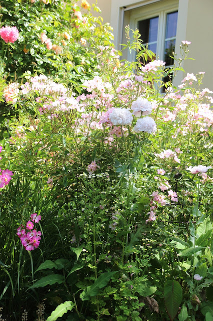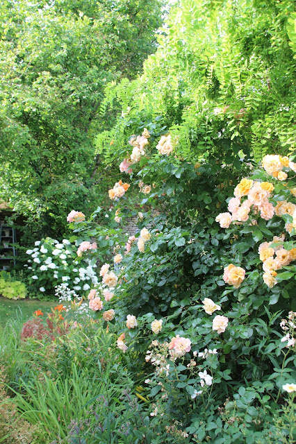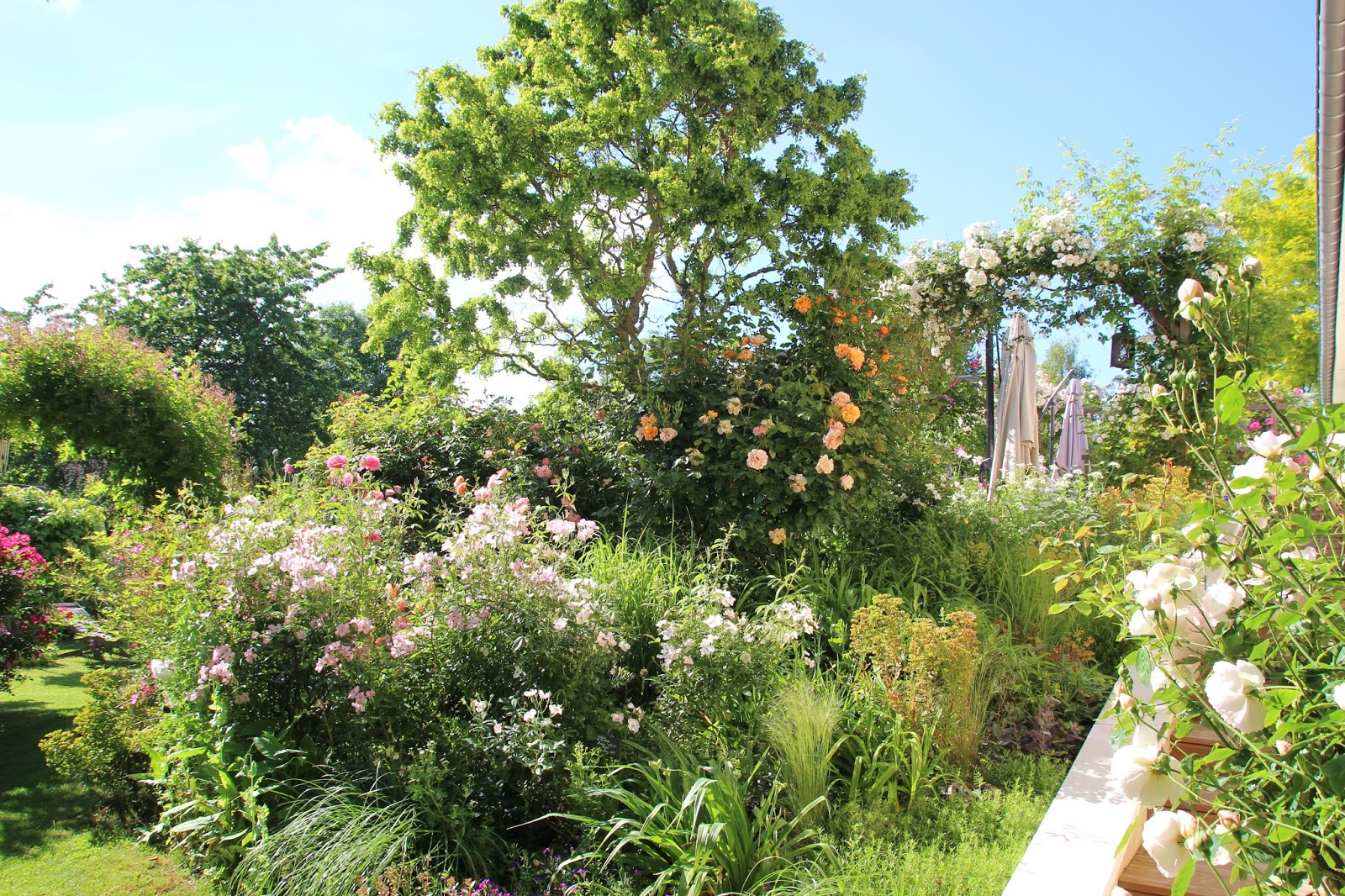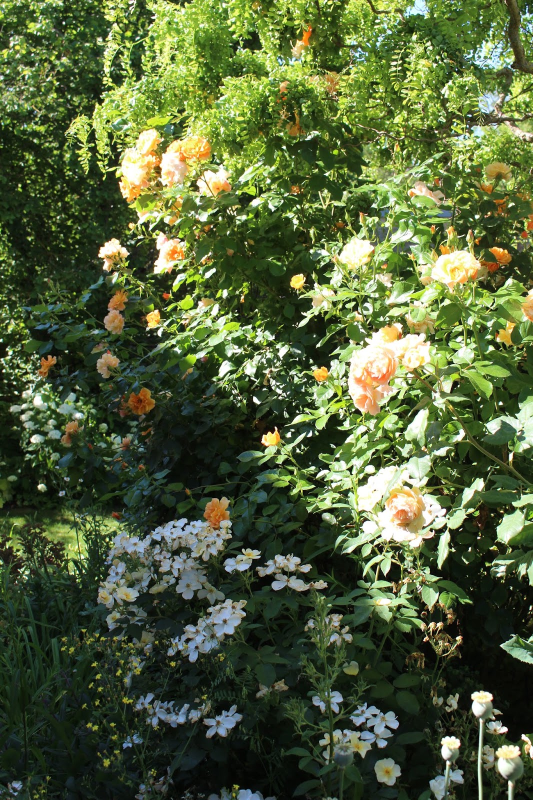 C’est le temps des hemerocalles, qui se mêlent aux floraisons des rosiers