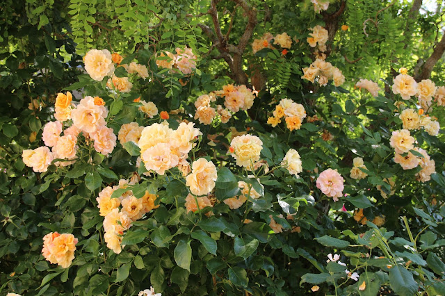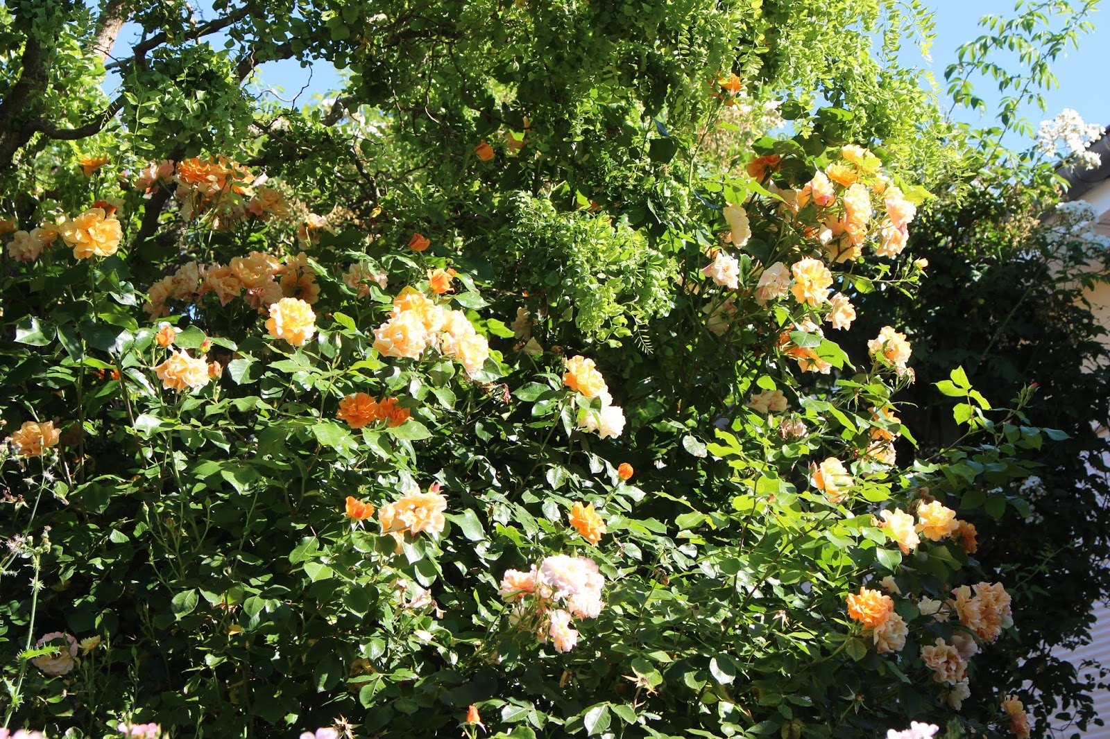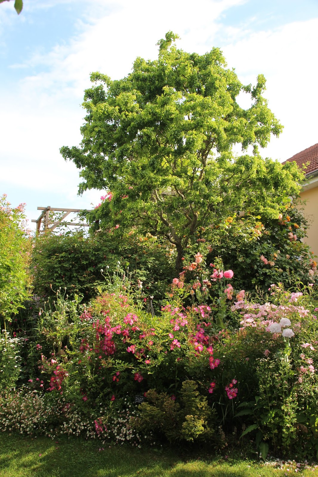 En arrière plan, près de l’acacia Twisty baby, fleurit le rosier Tequila de Meilland.