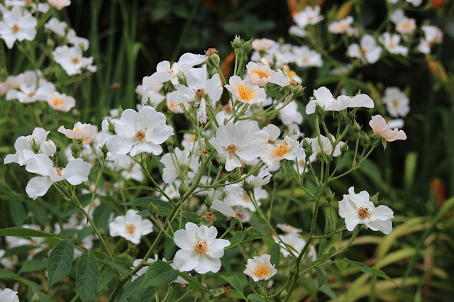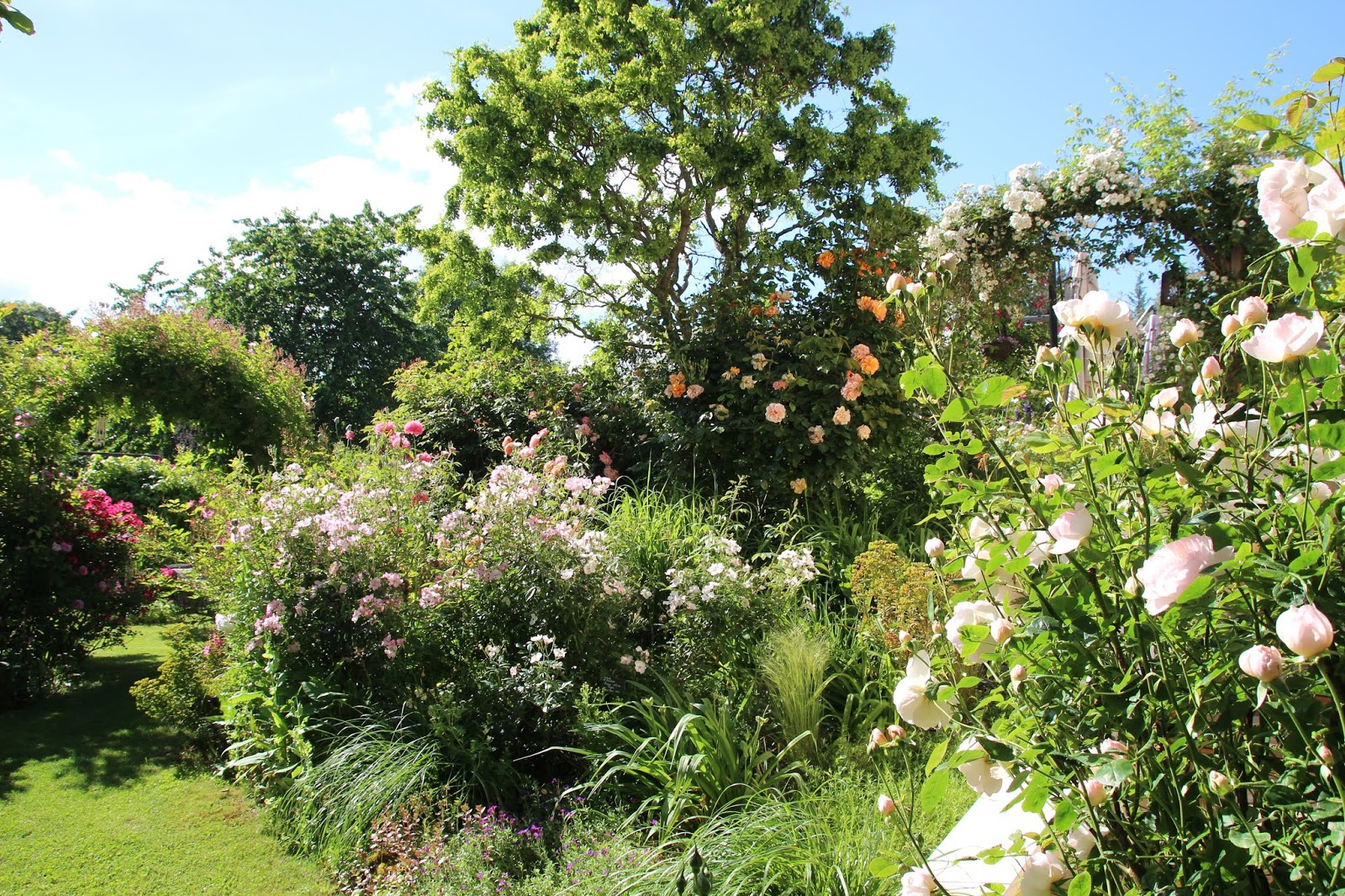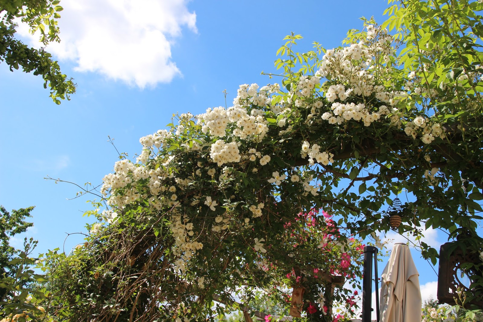 Le rosier liane Seagull anime l’arche en haut de la rocaille