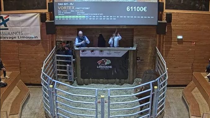 Mis à prix à 4 000 €, Vortex a fait monter les enchères en un éclair. « C’est un joli numéro », commentait le speacker à l’arrivée du veau dans l’arène. La première offre ? Pas moins de 20 000 € pour annoncer la couleur. Le jeune reproducteur,né sur l’Earl Steinmetz Elevage dans le Bas-Rhin, a fait monter les prix pendant près de 10 minutes. Les éleveurs se sont disputés le jeune limousin avec un entrain rarement vu sur les rings pour établir un nouveau record d’enchère sur la station. C’est une offre de 61 100 € qui sonnera la fin de la bataille, au profit de la SAS Desassure, dans la Creuse. L’animal « double quasiment le précédent record de Top Price » commentent le pôle de Lanaud et Interlim dans un communiqué.